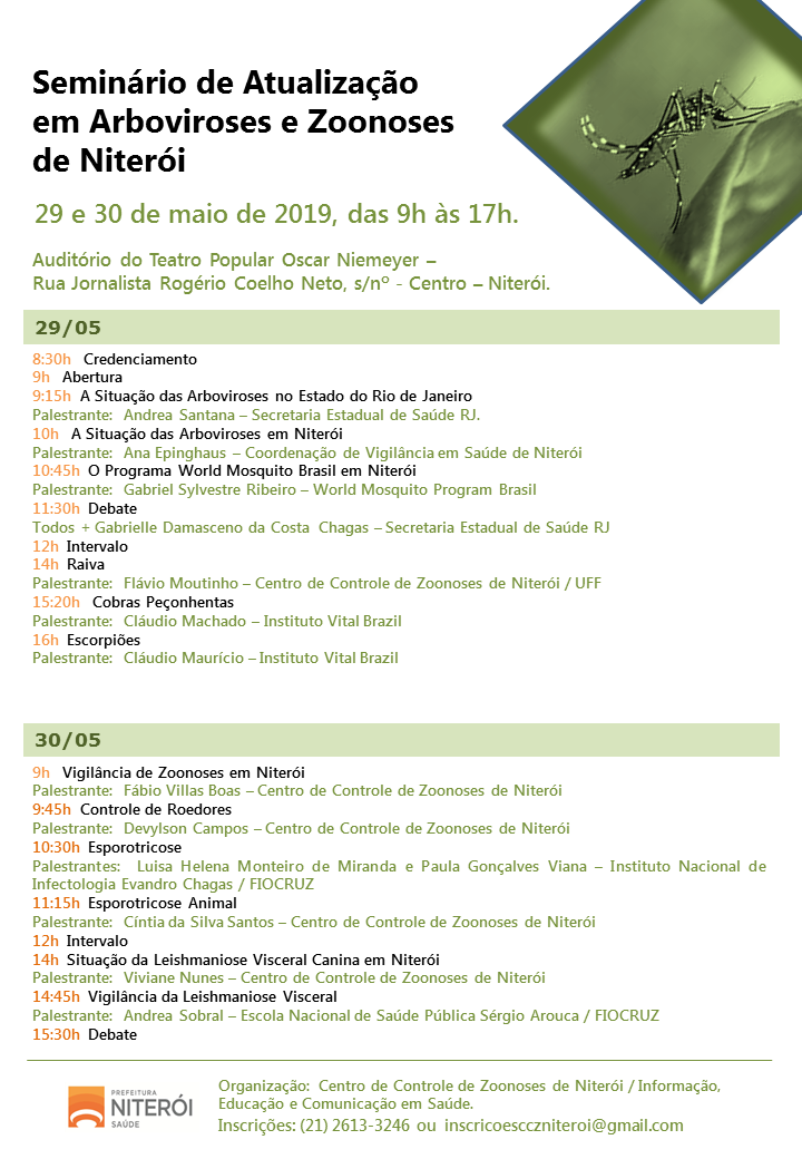 Arboviroses, Wolbachia, Raiva, Aranhas e Escorpiões, Cobras Peçonhentas, Roedores, Esporotricose e Leishmaniose. Esses serão alguns dos temas discutidos no SEMINÁRIO DE ATUALIZAÇÃO EM ARBOVIROSES E ZOONOSES DE NITERÓI, promovido pelo Centro de Controle de Zoonoses (CCZ), por meio do setor de Informação, Educação e Comunicação em Saúde (IEC).